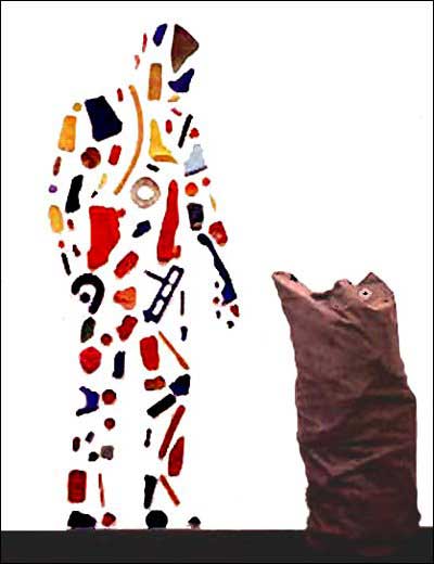 • 28 Tony Cragg, Selbstbildnis mit Sack, aus angespülten Plastikteilen, die er eingesammelt und zu einer Gestalt zusammen gesetzt hat an der Seite eines Seesacks. Die Materialien sind vom Menschen hergestellt oder zumindest bearbeitet und sind damit Bestandteile der heutigen Zivilisation.