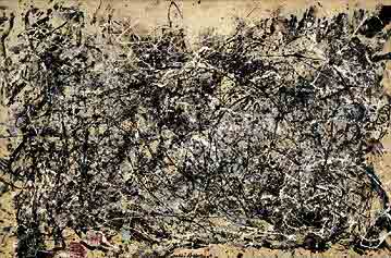 • 16 Pollocks, Number I, zeigt direkt die Gesten, die mit der Hand ausgeführt wurden. Er schüttet und tropft Farbe, das sogenannte Dripping. Eine indirekte Methode, denn die Hand hat keinen unmittelbaren Kontakt zur Malfläche.