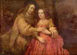 • 10 Rembrandt die Judenbraut 1665, Material- und Werkzeugspezifische Spuren werden sichtbar. Pinselstriche sind sichtbar im pastosen, reliefartigen Farbauftrag. Die Fraktur zeigt Spuren der Werkzeuge Pinsel und Spachtel.