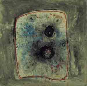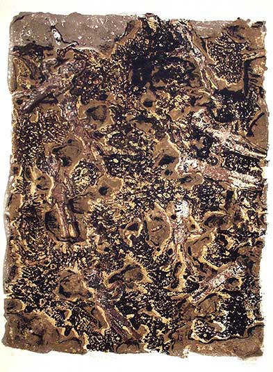 • 18 Jean Dubuffet, Friuts et terre, gehört zum Genre der Materialbilds, zeigt formale Analogien zum Tachismus, ist aber keine gestische Malerei. Es besteht aus stark texturierter Pappmaché als Ergebnis eines Gestaltungsprozesses der Stofflichkeit des Materials.