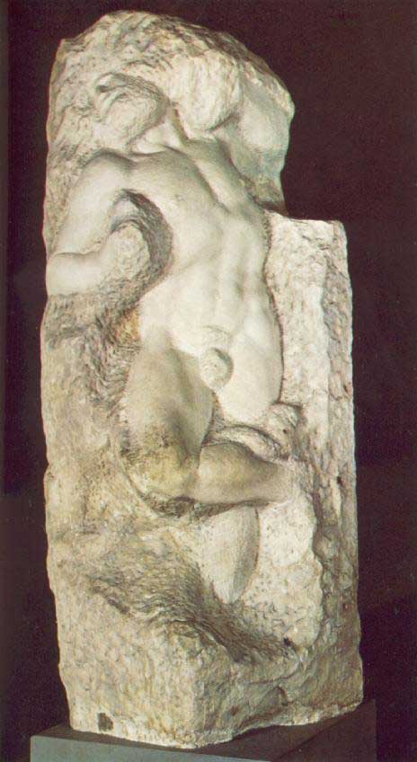 • 06 Michelangelo, Erwachender Sklave 1525. Individuelle Modifikation einer Norm, keine Rede von Verfall als Dokument der Zeit. Aspekt der Entstehung wird verknüpft mit dem Unvollendeten. Es ist ein Stadium des Aufbaus und kein Zeichen von Verfall. Die Züge der Bearbeitung des Marmors zeigen, wie der Stein ursprünglich war. Spuren als Zeichen der Bearbeitung des Steins und der verwendeten Werkzeuge.