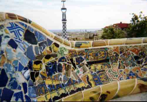 • 21 Antoni Gaudí setzt Keramik- und Glasstücke, Scherben eingepresst in Zement als dekorative Oberflächengestaltung ein. Bank Parc Güell Barcelona.