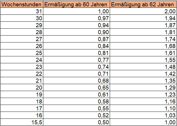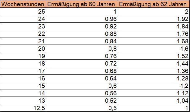 Ab dem Schuljahr, in dem sie 62 Jahre alt werden, erhalten sie eine weitere Deputatsstunde ermäßigt. Teilzeitbeschäftigte erhalten entsprechend ihres Deputatsumfangs anteilig ihre Stundenreduktionen.